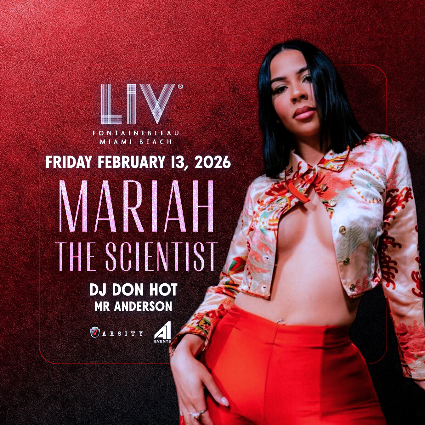 One of R&B's most captivating voices takes over LIV Nightclub Miami on Friday the 13th as Mariah The Scientist headlines a night of sultry, heart-on-sleeve music inside the legendary Fontainebleau Miami Beach. With Billboard Hot 100 hits, a platinum-certified catalog, and one of the most remarkable come-up stories in modern R&B, Mariah brings her astral sound and confessional songwriting to Miami's most iconic stage.
